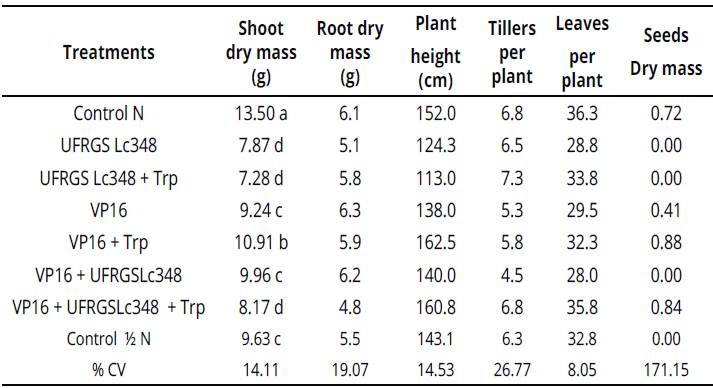Another important finding was the production of Sudan grass seeds 70 days after seeding. When inoculating isolate VP16 (0.41g of seeds.plant-1), VP16 + Trp (0.88g of seeds.plant-1) and VP16 + UFRGS Lc348 + Trp (0.84g of seeds.plant-1). In Control treatment / N, no seeds production during the experiment could be observed.