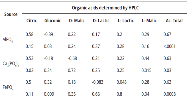 Table 2: Pearson correlation coefficients between the organic acid and soluble phosphorus in each of the sources of phosphates, generated during fermentation
