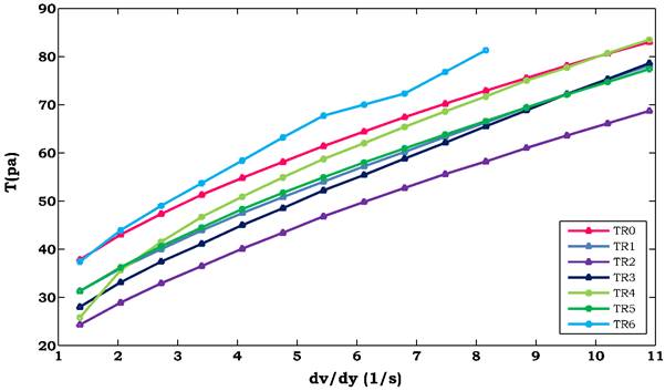 According to their rheological characteristics, which are as follows: molding, enrobing, hand-dipping and chocolate chips, respectively (Bloomer, 2015). Of the seven experimental samples, the control and six of them, are located in two areas of low Casson viscosity, low minimum yield stress. In fact, treatment TR6 (sky blue dot), does not appear in any of the mentioned application areas.
