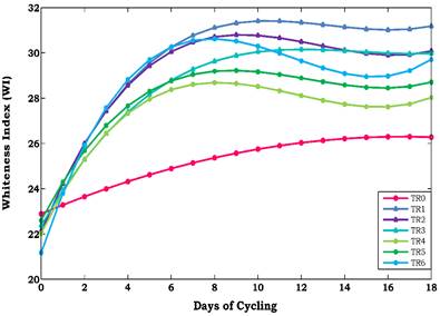 Figure 2, shows how whiteness index (WI) changes during the accelerated bloom study, for all samples, WI increased over time, but the initial rate was variable.