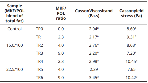 Conversely, the tested samples had achieved a relatively low Casson viscosities and yield stress, which have allowed a most appropriate for molding and enrobing. In addition, MKF content tends to increase viscosity. Although viscosities and yield stress were similar, there were statistically significant results among sample groups.