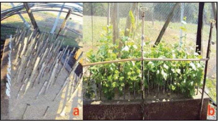 Figure 2: P. acerifolia cuttings. In sand bed on planting day (a); sprouted cuttings (119 days after planting) (b).