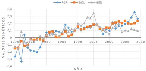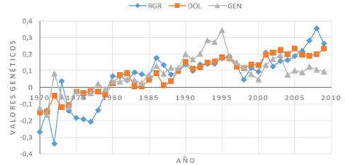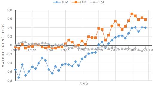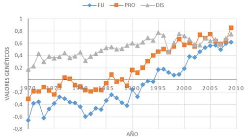 En la Figura 1 se observa que las tendencias de las variables PRO y DIS, con pendientes de 0.029 y 0.011, mantuvieron Valores Genéticos (VG) negativos hasta 1991 y 1995, respectivamente. La FIJ (b = 0.031), también en este grupo, presentó valores positivos durante todos los períodos, siendo la única variable con esta tendencia dentro de la ganadería. El valor más alto de VG (0.8493) lo presentó PRO en 2009.