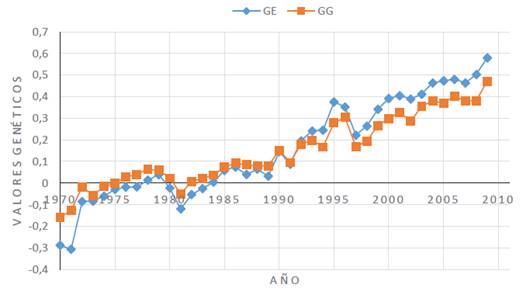 El conocimiento de las tendencias genéticas en el tiempo es de vital importancia para el ganadero con el fin de valorar el progreso genético y el reajuste de criterios y objetivos de selección, permitiendo un cambio en la estructura genética de la población con el incremento esperado en las unidades comportamentales, basados en el uso de los VG predichos.