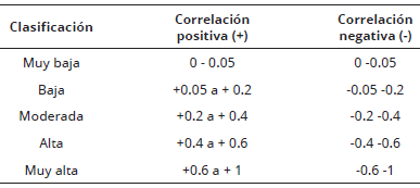 En el Tabla 3 se incluye la clasificación utilizada en los coeficientes de correlación para las unidades comportamentales.