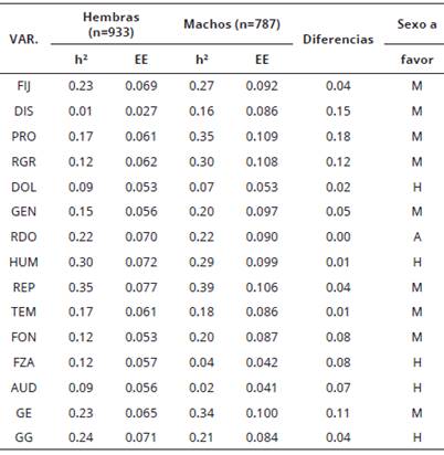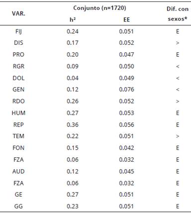 Tabla 5: Heredabilidades, errores estándar y diferencias con alguno de los sexos de las unidades comportamentales en conjunto para hembras y machos de la ganadería EGC (n=1720). Ganadería Ernesto González Caicedo, Popayán, Colombia.