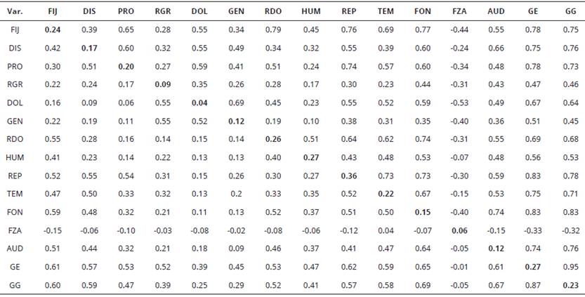 Las correlaciones de todo tipo con la variable FZA dieron en su mayoría valores negativos, alcanzando los valores de rg más altos con DOL (-0.53), seguidos por FIJ (0.44), GEN y FON (-0.40 ambas), todos dentro de rangos considerados negativamente altos y moderados. Los valores de rp para estos conjuntos fueron, respectivamente, de -0.08, -0.15, -0.02 y -0.07. El único valor positivo de FZA fue con TEM (0.04), considerado muy bajo.