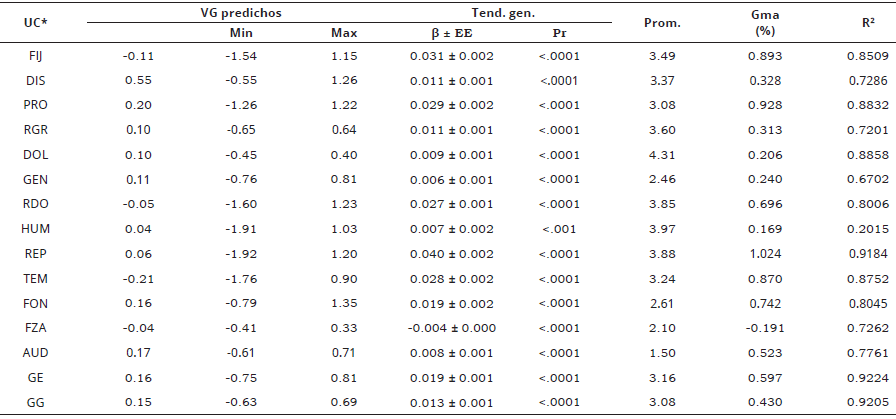 Para estudiar la evolución en el tiempo de las UC consideradas en este estudio, se tomó un periodo de análisis de 40 años, comprendidos entre 1970 y 2010. En la Tabla 7 se presentan los intervalos de los VG predichos para las variables analizadas en la ganadería EGC durante las faenas de tienta y de lidia. Los valores medios de estas variables variaron entre -0.21 y 0.55 para TEM y DIS, respectivamente, con un promedio general de 0.093. Todas las tendencias de los VG fueron positivas y diferentes de cero, a excepción de FZA que presentó valores negativos (-0.004 ± 0.0004).