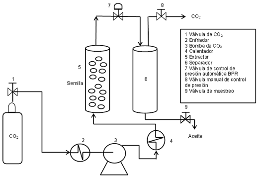 La obtención de aceite de semillas de maracuyá se realizó mediante la tecnología de extracción con fluidos supercríticos, en un equipo Waters SFE 500 (USA), utilizando dióxido de carbono (CO2) al 99.9% de pureza (Cryogas, Colombia) como solvente. El diagrama del proceso de extracción se indica en la Figura 1.