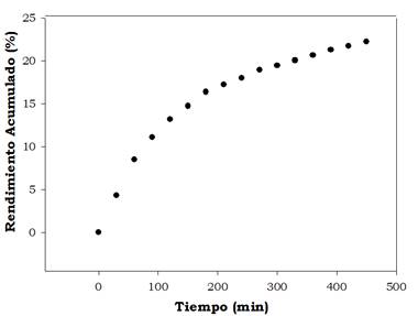 En la Figura 2, se presenta la curva de extracción de aceite de semillas de maracuyá a presión y temperatura constante (275 bares - 50 ° C). El porcentaje de aceite extraído fue de 22.23% transcurridos 450 minutos de extracción.