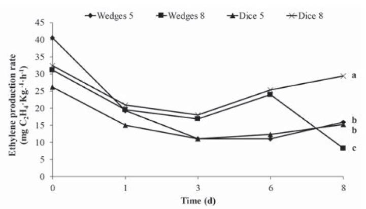 After 3 and 6 d of storage, the wedges and dice stored at 8°C showed an ER 37% and 53%, respectively higher in comparison to the same cutting types stored at 5°C (11.1 and 11.7 mg C2H4־kg-1-h-1, respectively). At the end of storage, dice stored at 8°C showed higher ER (29.4 mg C2H4־kg-1-h-1) in comparison to the cutting types stored at 5 and 8°C (Figure 2).