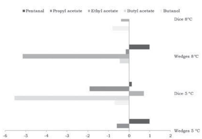 The relative content of these compounds decreased in the wedges stored either at 5 or 8 °C and in the dice stored at 5°C. Instead, butyl acetate and propyl acetate were not identified in the dice stored at 8 °C. Among all the compounds identified, pentanal was the only compound which did not show a reduction of its relative content (Figure 3).