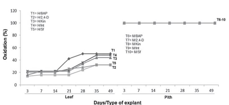 In the Pith treatment with BAP (T6), callus production was detected from 14 days, whereas in leaf at 28 days, it can be seen the pith explant with BAP (T6) had a higher response rate than the leaf explant (T1). In pith explants, oxidation was observed from the experiment establishment and it appears as constant during the 49 days (Figure 3).