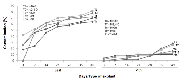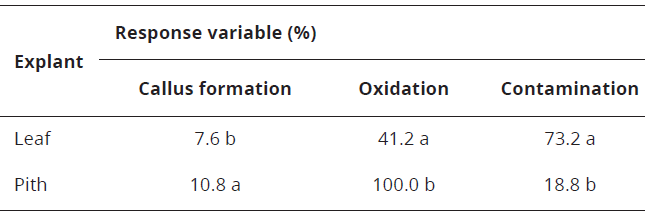 In the present work, it was observed the explant type was statistically significant in the results of the variable contamination, registering a higher percentage of this variable in leaf fragments than in pith explants (Figure 5).
