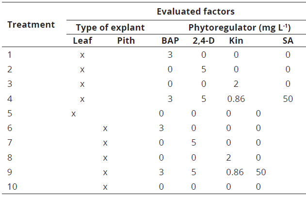The explants were sown in 60x15 mm petri dishes, the leaves were established with the beam towards the culture medium and pith explants maintained the polarity at the time of sowing. All explants were maintained at 25 ° ± 2 ° C, illuminated by fluorescent tubes in cold light with a lighting time of 16 h/d, throughout the experimental period.