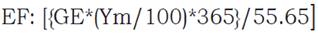Where: emission factor (EF), kg CH4.animal-1.year-1; Gross Energy Intake (GE), MJ.animal-1.day-1; Ym: methane conversion factor, percentage of gross energy in converted food to methane and 55.65 (MJ.kg-1 of CH4), is the energy content of methane.