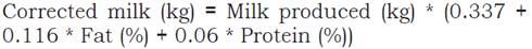 Therefore, kg of meat were obtained from the sum of animal live weights, including calves (male and female), bulls, steers, heifers, and animals for sacrifice (IDF, 2010). The produced milk was corrected in fat (4%) and protein (3.3%) (Equation 11).