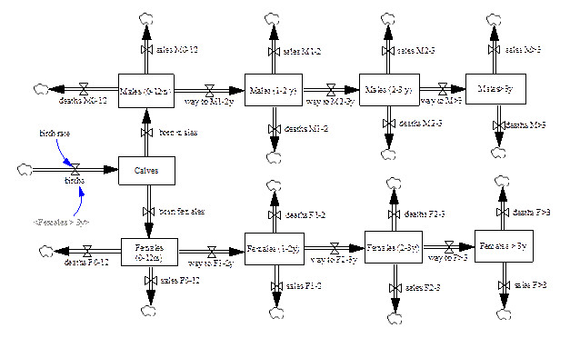 The population chain started with the input flow, which represented the cattle births and finished with the output flows correlated with cows and steers under 3 years old. The inflows, have allowed passage among categories (levels) and were directly affected by auxiliary variables (constants), which were determined by the spent time in each group. The outflows for each group, simulate mortalities and sales, affected by auxiliary variables, which express their respective rates. In addition, auxiliary variables, were introduced into the birth rate model, calving interval, parity, among others. The information for these variables was obtained accordingly to FEDEGAN (2014).