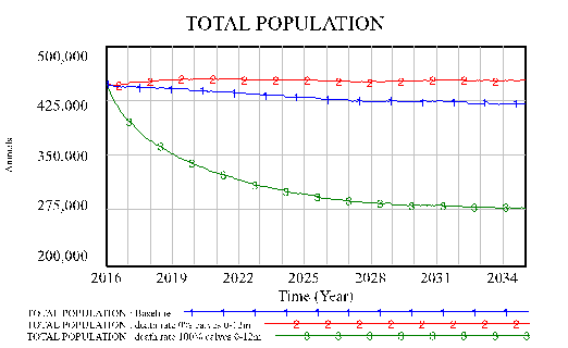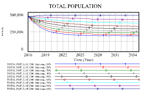 Figure 2: Behavior of the cattle population of Valle del Cauca, Colombia under extreme conditions in calves death rate (0 to 100%) between 0 and 12 months old.