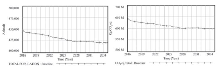 Model formulation to simulate the herd behavior, according to trend values obtained by vaccination cycles of the past 6 years. Presumably, Valle del Cauca livestock with a downward trend of 27000 animals over 20 years of simulation, seeing this behavior reflected in GHC decreased in 45557000 kg of CO2eq (Figure 5). The decreased pattern exhibited in the Valle del Cauca cattle population is due to herd outflows (animal sales and deaths), which is greater than inflows (birth rate and imports).