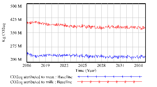 Figure 6: Annual amount of CO2eq (kg) attributed to meat and milk (emission intensity).