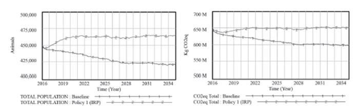 After testing the model, emission factors for each category were added, represented by auxiliary variables. After testing the model of population chain, emission factors were added to each category, represented by auxiliary variables, in order to estimate dynamically the production of greenhouse gases and carbon footprint caused by cattle activity in Valle del Cauca department, Colombia. In addition, 3 different policies were raised in order to improve the herd efficiency, reduce GHG emissions and kgCO2eq proportions per kg of generated product. Raised policies were included as follows: 1) improving reproductive parameters (IRP): increased birth, from 83 to 90% and decrease in age at first calving, from 34.8 to 30 months of age. 2) increased production of milk per cow (IPM10), from 5.33 to 10 kg.day-1. 3) policies integration 1 and 2 (P1+P2). Policies were raised according to the recommendations proposed in the research of Pereira et al. (2009).