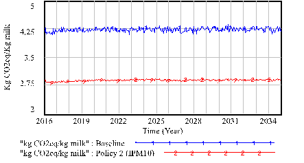 Figure 9: Effect of integration policies 1 and 2 on the annual milk production in the Valle del Cauca department and its emission intensity