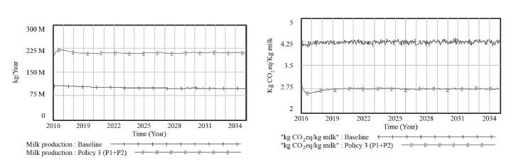 For policy 3, the dynamics of bovine population changed relatively in terms of the baseline, which had a directly proportional effect on the amount of produced CO2eq. Milk production increased by more than 100 million kilograms per year in relation to the baseline and proportion of kgCO2eq. kg-1 of decreased milk in 1.4 units (Figure 9).