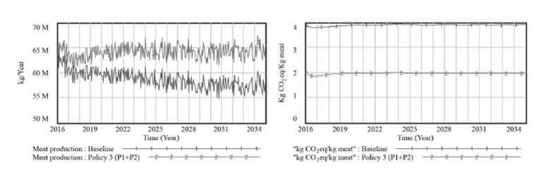 Figure 10: Effect of integration policies 1 and 2 on the annual meat production in the department and its emission intensity.