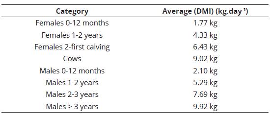 It is important to note that divided livestock population were into groups according to the methodological sequence proposed by the IPCC (2006), average daily of dry matter intake per animal for each category was estimated, respectively. The obtained values are shown in Table 1.