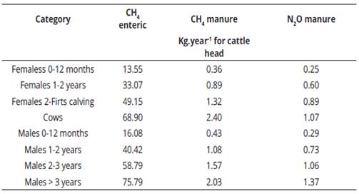 Table 2, shows the detail level for each EF obtained using the equations Tier 2 of IPCC, which vary significantly from standard values proposed by the Tier 1 (72 and 56 kg.animal-1.year-1 of CH4 enteric for dairy cows and others animals, respectively. In addition, 1 and 2 kg.animal-1.year-1 of CH4 in terms of the excreta for all categories.