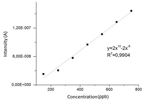 To generate the calibration curve, the current (signal or response) was plotted at -0.599V as a function of metal concentration, and the statistical data treatment was determined by determining its slope (sensitivity) and correlation coefficient. The sensitivity of the voltammetric method, was established by calculating the slope of the calibration curve.