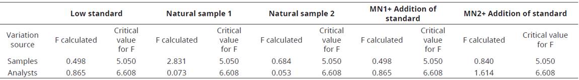Analysis of variance (Table 2), indicated there was no statistically significant difference between the lots and between the analysts since the value of F calculated does not exceed the critical F value. The counter samples analyzed by atomic absorption spectrophotometry did not present statistical differences (P <0.05) in the Cadmium content.