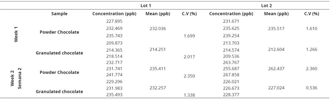 For each week and batch, Cadmium concentrations in chocolate powder were higher than granulated chocolate, possibly due to the fact the moisture of the product may generate a greater or lesser matrix dilution. The results (from 214 to 263 ppb) are higher than those found by Yanus et al. (2014), for different chocolate brands (84 - 141 ppb), and for Dahiya et al. (2005), in chocolates and Candy shop (0.001 a 2.73 ppb). Which can be caused by contamination from planting, harvesting and fruit transporting during the manufacture of the products when get in touch with water, equipment or supplies which have this metal. In addition, it can be related to soil contamination, which occurs in cacao crops in Ecuador (Chavéz et al., 2015).