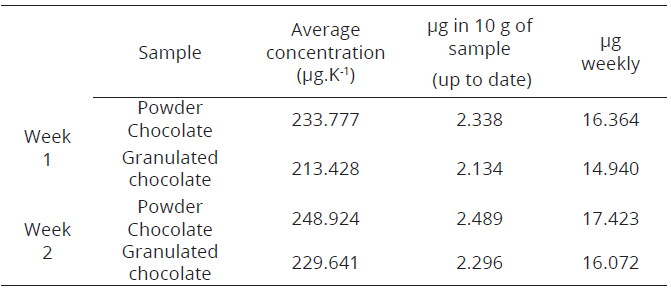 Taking into account the tolerable weekly Cadmium intake value established by OMS (2014), (7 µg.kg-1 of body weight), the equivalent value (μg) was calculated for a weight of 30 kg (210 μg), 50 kg (350 μg) and 70 kg (490 μg). According to this estimate, and assuming a daily diet of 10 g of table chocolate, consumption levels (μg) exhibited in a week ranging from 2.1 to 2.5 μg can be obtained (Table 4).