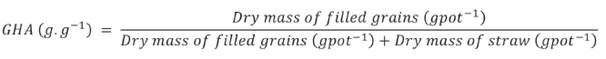 The grain harvest index (GHI) was obtained dividing the dry mass of filled grains by the whole shoots dry mass (including the grains), as the Equation 2.