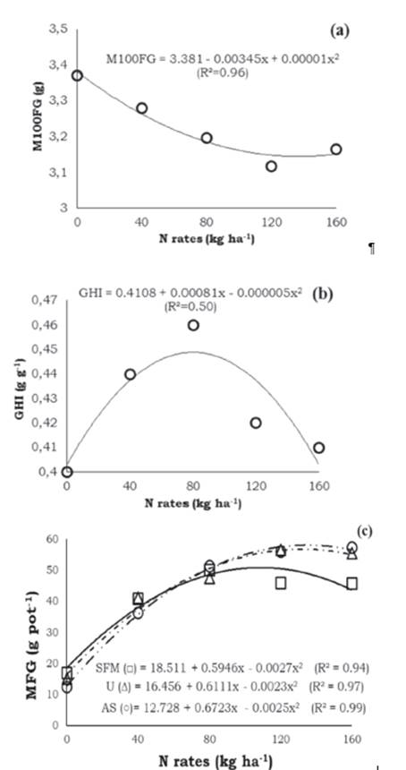 In addition, the 100-grain mass was reduced as a function of N rates, being adjusted to a quadratic model with minimum point estimated as 136 kg N ha-1 (Figure 3a), independently of the N source.