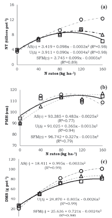 Figure 1: Number of tillers per pot (NT) (a), plant mean height (PMH) (b) and dry mass of shoots (DMS) (c) of upland rice plants, cv. IAPAR 117, as a function of N rates from the sources ammonium sulphate (AS), urea (U) and sulfamoo( (SFM).