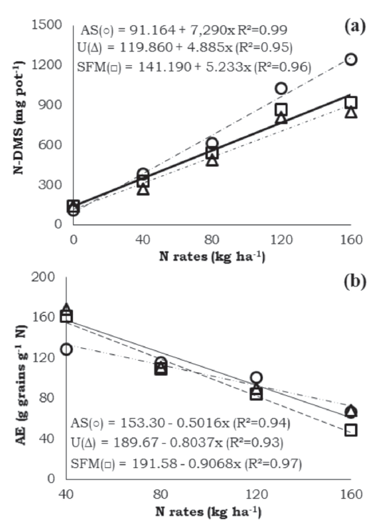 It was verified an increasing in N-DMS for different N sources, which have adjusted to linear models, indicating the applied N rates were not sufficient to reach the maximum points (Figure 2a).