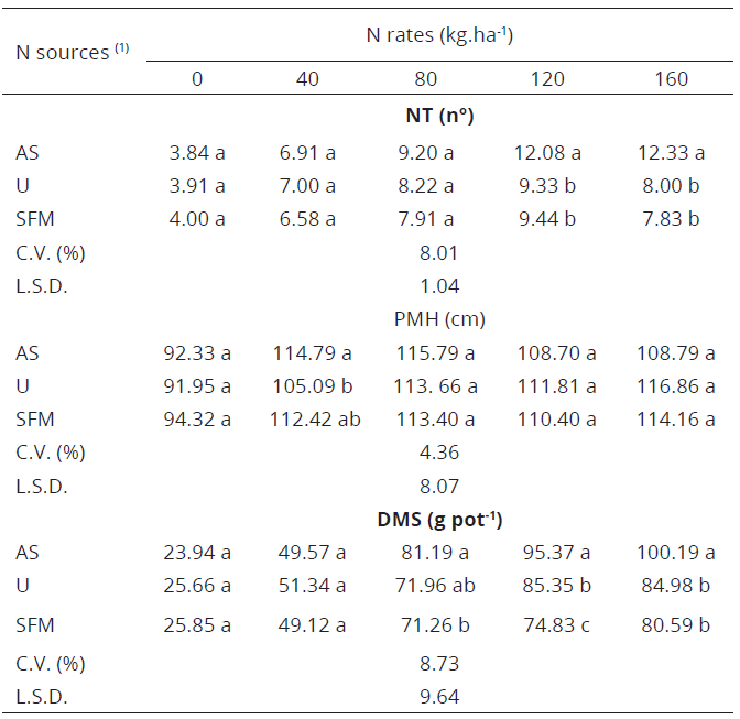 Means followed by the same letters in the columns are not different by Tukey test at 5% significance. (1) AS = Ammonium sulphate; U = Urea; SFM = Sulfamoo(. C.V. = Coefficient of variation; L.S.D. = Least significant difference.
