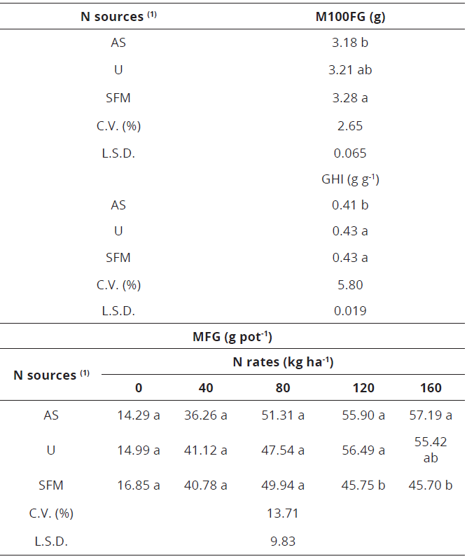 Therefore, among N sources, GHI varied from 0.41 to 0.43 (Table 3) and this result is in accordance with Fageria et al. (2010), who indicates IGH values for commercial crops ranged from 0.36 and 0.52. Nevertheless, N sources, which determined the lowest DMS and N-DMS increasing, were the same, which also presented the highest values for GHI, as well as the M100FG. This corroborates the idea that the higher is the N uptake, which was observed with ammonium sulphate, the higher is the vegetative growth, generating an imbalance in the photosynthates distribution, which generates smaller grains and lower GHI.