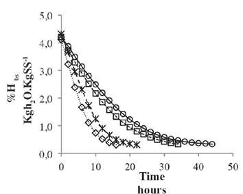 Conversely, notice the presence of a first point at 2 m.s-1 in 3.5±0.0 and 2.9±0.1 kgh2O.kgSS-1 for 50 and 60°C, respectively.