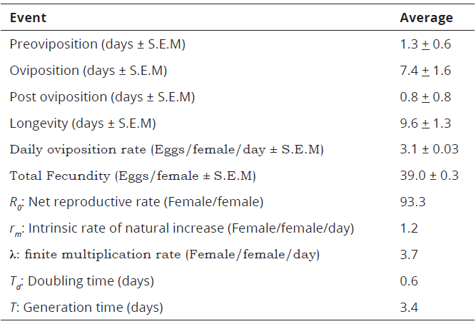 Under the conditions of this experiment, the species generation growth rate was 120% (Table 2), which is difficult to find in another species. Results show that indicators of its life table (R o =93.3, rm=1.2, λ=3.7, T= 0.6 and TD= 3.4 days) were higher compared with those achieved by Ferreira, Oliveira, Haji & Gondim (2006), in grapevine (R o= 30.12, rm=0.314, T=10.81 and λ=1.37).
