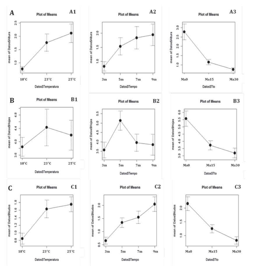 Figure 1: Average plant heigh (A), number of leaves (B) number of nodes (C) obtained in the different evaluated treatments: Temperature°C (A1, B1, C1). Time/months (A2, B2, C2) and manitol gL-1 (A3, B3, C3).