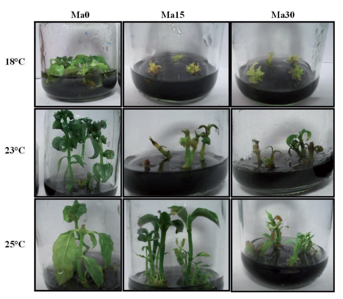 A morphological trait of the developed plants from the submitted nodes to different temperature treatments and the mannitol osmotic regulator, were differentiated in terms of plant height, leaf size and coloration (Figure 2). Plants maintained at 18°C with and without mannitol during the conservation stage presented a pale green coloration with chlorotic zones, which became more acute with time. The recovery of these plants under standard conditions took at least 4 months to reach the vigour of the control plants (23°C without mannitol), while those that remained at 23 and 25°C, which had achieved this response variable within 2 months of being transferred into the recovery culture medium. On the other hand, was found an excessive leaf growth and root formation in plants maintained at 25°C without mannitol.