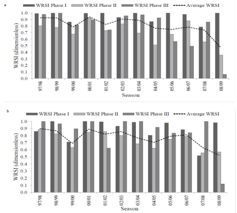 Figure 2: Water Requirements Satisfaction Index (WRSI), considering the development phases of sugarcane plant (a) and ratoon cane (b), seasons 97/98 to 2008/09, in Paranavaí, Southern Brazil.