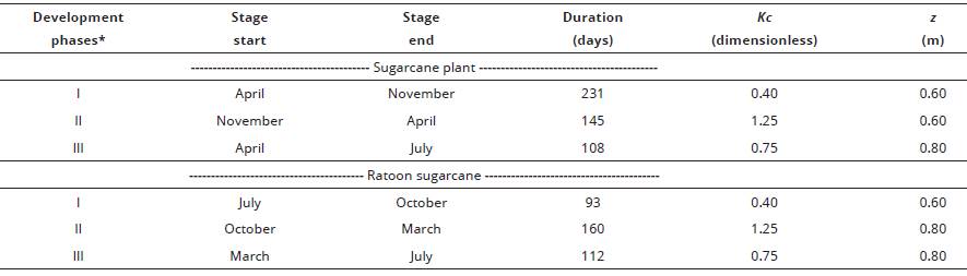 Table 1: Sugarcane rooting system effective depth (z), development phases duration and their crop coefficient (Kc).