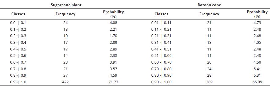 Greater frequency distribution details of the ten-days CWB components to sugarcane plant and ratoon, at 1997/98 to 2008/09 seasons, in Paranavaí can be checked in Table 5.
