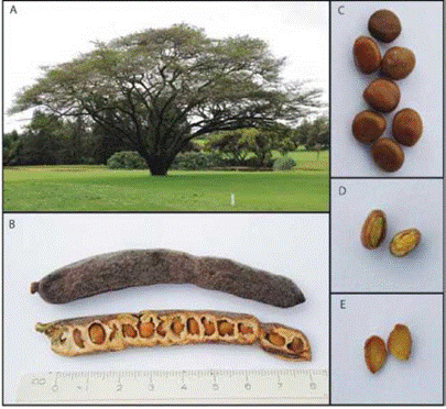 Figure 1: Plant material. (A) Adult tree. (B) Seed pot. (C) Seeds. (D) Seed coat peeled. (E) Cross-section of a peeled seed.