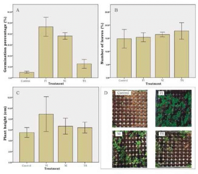 Each treatment is labeled by two capital letters: FI (filed), NI (nicked) and TS (thermal scarification). Three variables are shown: (A) germination percentage, (B) number of leaves and (C) plant height. In panel D, a seedbed tray at two months after sowing is shown for each treatment, pointing out differences in seed germi nation. *Significant differences were found using ANOVA at 5% significance level. Bars represent standard deviation.